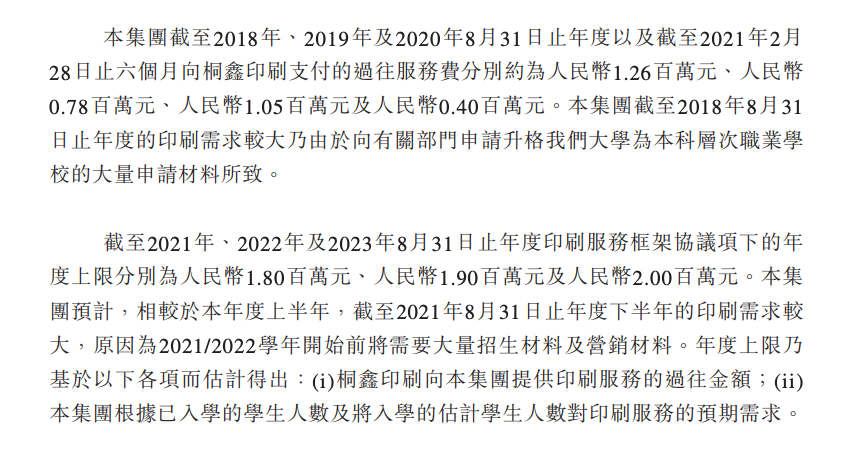 根据招股书,2021年,广东景大与卢彩凤、冯兵昌夫妻俩全资拥有的桐鑫印刷签订印刷服务协议,桐鑫印刷就招生材料、教材、营销材料及其他印刷服务向广东景大及大学提供印刷服务。其中,2018年至2021年2月28日止的六个月,景大教育向桐鑫印刷共支付服务费349万元。