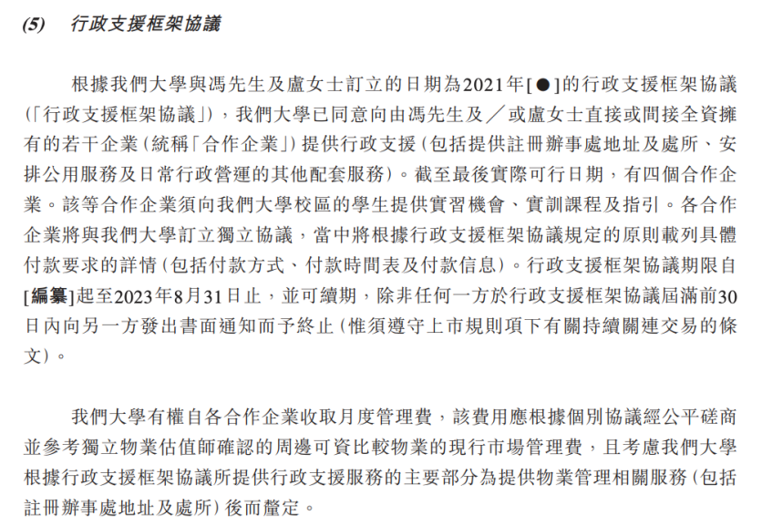 夫妻俩旗下公司还涉及广州科大职业技术大学的行政支援业务。根据行政支援协议,卢彩凤、冯兵昌夫妻俩直接或间接拥有的若干企业为大学提供行政支援,包括提供注册办事处地址及处所、安排公用服务及日常运营的其他配套服务。