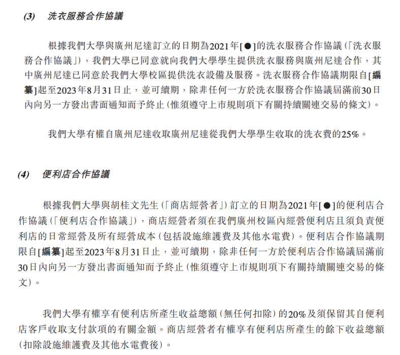 2021年,广州科大职业技术大学与广州尼达签订洗衣服务协议,广州尼达为大学校区提供洗衣设备及服务。根据协议,洗衣费的协议收益分成为25%。其中,广州尼达由卢彩凤直接拥有40%股权,冯华(冯兵昌的妹妹)占股20%、卢彩凤的两名亲属占股30%、一名独立第三方拥有10%股权。