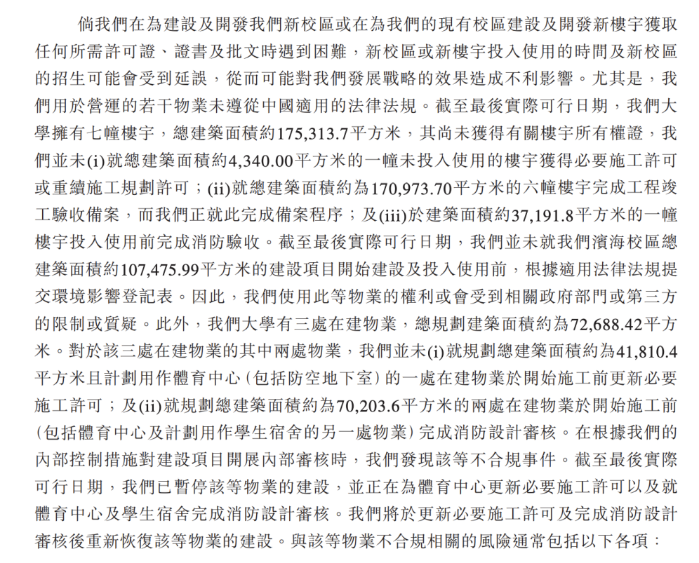 招股书显示,广州科技职业技术大学拥有七幢楼宇,总建筑面积约17.53万平方米,尚未获得有关楼宇所有权证。其中,一幢未使用的楼宇并未获得施工许可或重续施工规划许可;六幢楼宇尚未完成工程竣工验收备案程序;一幢楼宇投入使用前尚未完成消防验收。截至最后实际可行日期,景大教育未就滨海校区提交环境影响登记表。