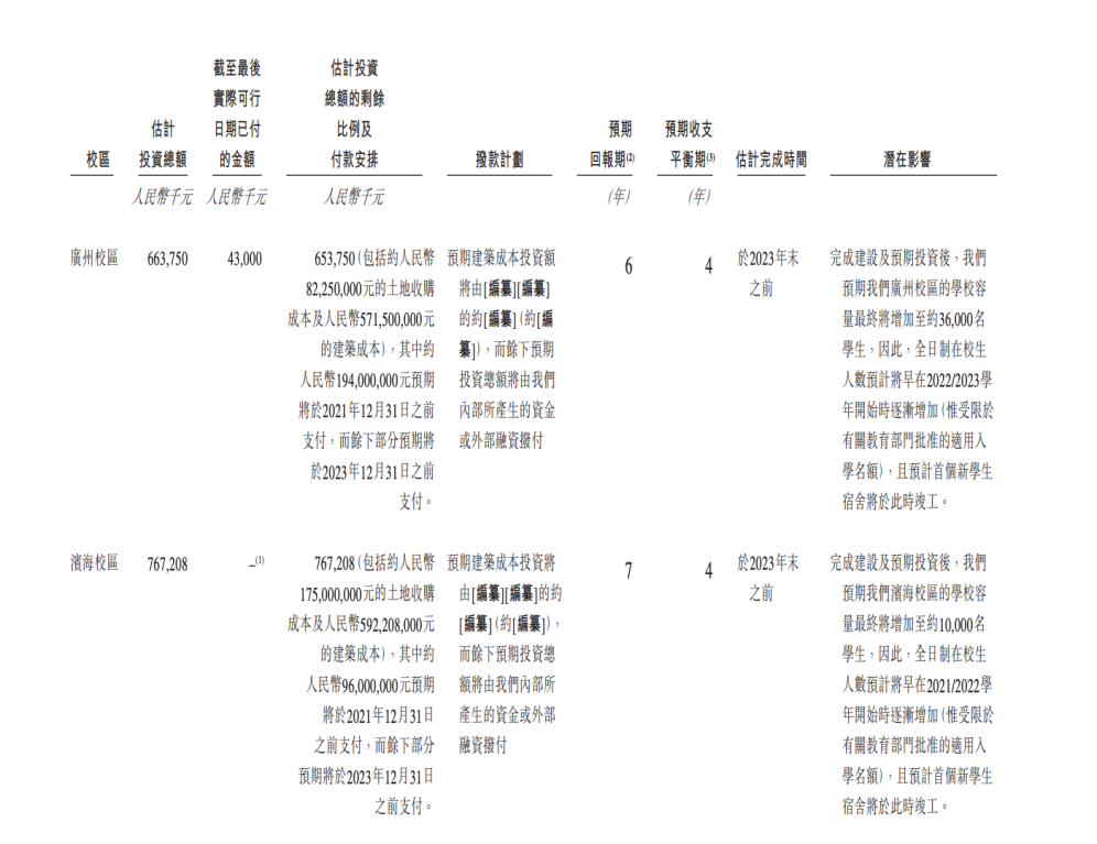 此外,根据招股书披露的校区投资付款安排,约1.94亿元将于2021年12月31日之前支付广州校区的建设,余下部分预期将于2023年12月31日之前支付。
