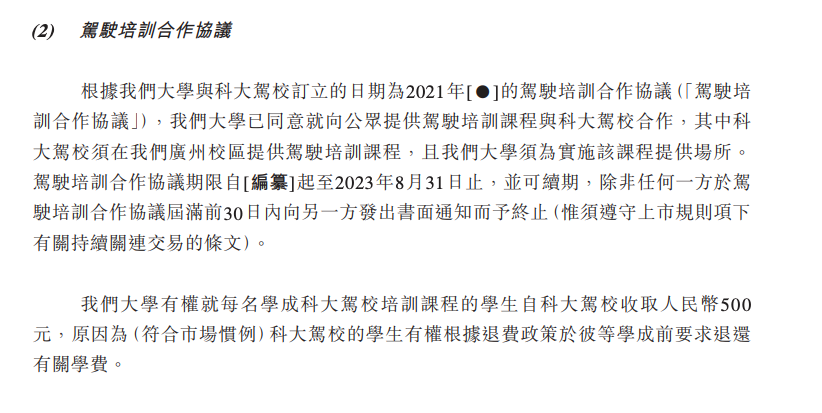 驾校业务也是广州景大收入的一部分。根据招股书,2021年,广州科大职业技术大学与卢彩凤、冯兵昌夫妻俩成立的科大驾校签订合作协议,每名学成科大驾校培训课程的学生,科大驾校需给到景大教育500元。