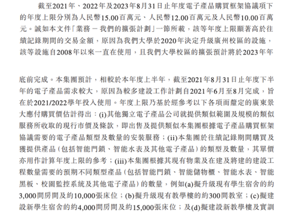 景大教育表示,2021年下半年,电子产品的需求量较大,这些电子产品的采购都来自于科大创新。包括现有物业及在建工程的需要的电子产品,升级现有学生宿舍的3000间房间及10000张床位,升级现有教学楼约300间教室,建设新学生宿舍约4000间房间及15000张床位;建设新教学楼及实训楼约150间教室等等。