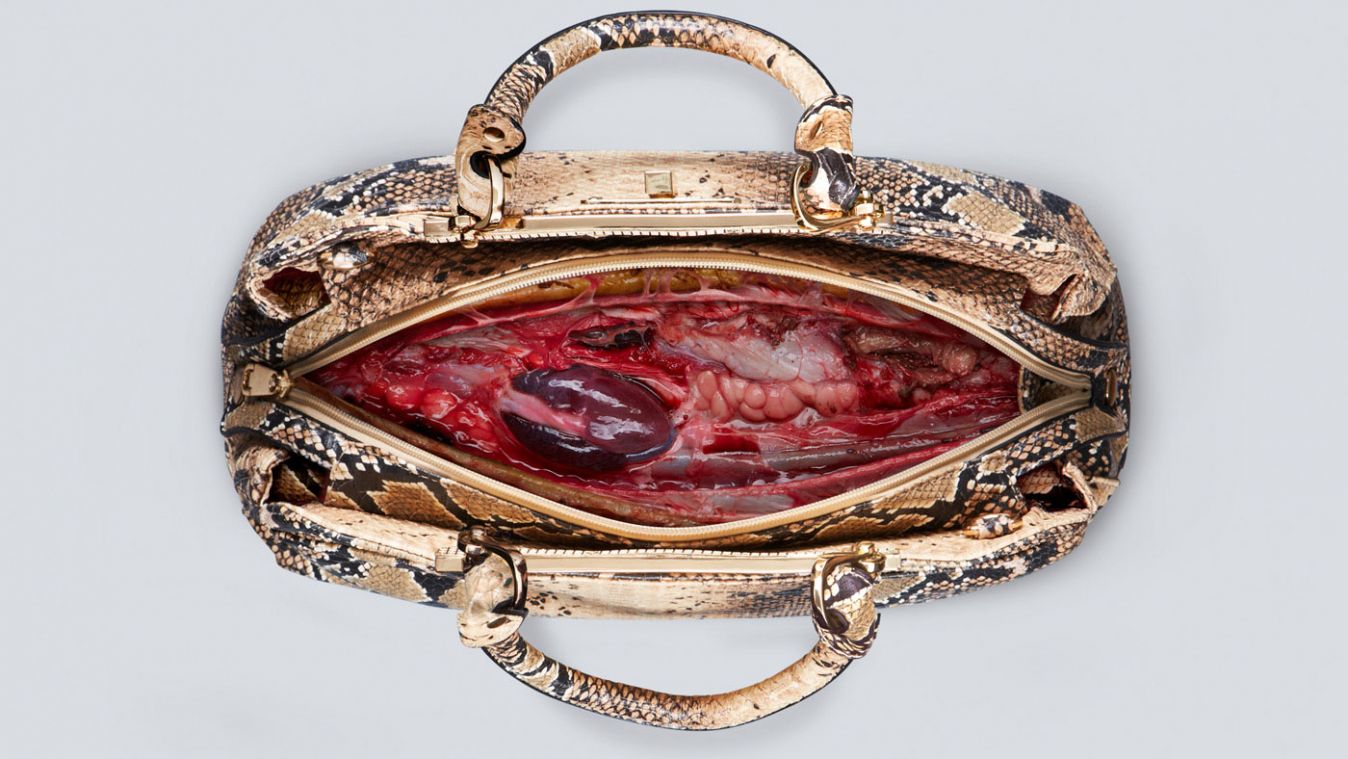 蛇皮也是时尚界的宠儿。但蛇被剥皮的过程也相当血腥——人们把蛇固定在树上,切开身体活着剥皮。