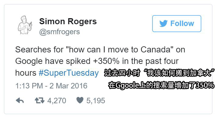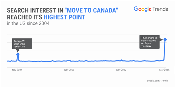 Google的工作人员披露,川普宣布初选结果后4个小时内,“我该如何搬去加拿大”的新闻搜索量飙升了350%。