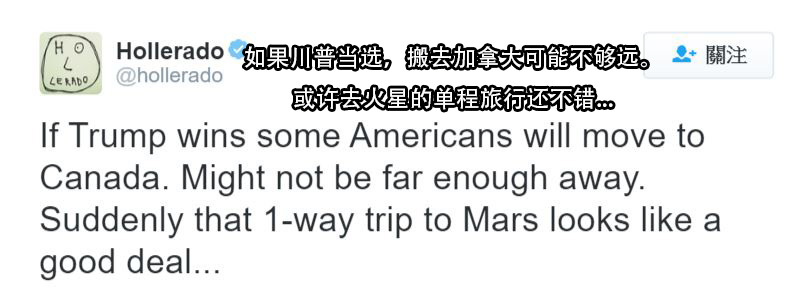 当然也有人认为,加拿大和墨西哥都不够远,建长城和闹独立也还是不够安全,为了远离川普,我们最好的选择还是移民火星吧。并且还要是有来无回的那种,再也不想回来了…