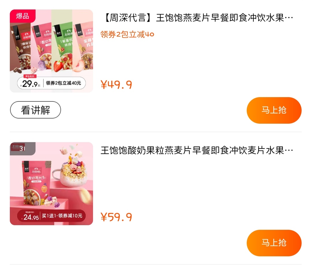 王饱饱除了会请明星代言,也会在自己的直播间定期直播,直播中的福利以及优惠力度是极大的,所以基本上可以获得大量的固定流量。