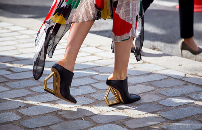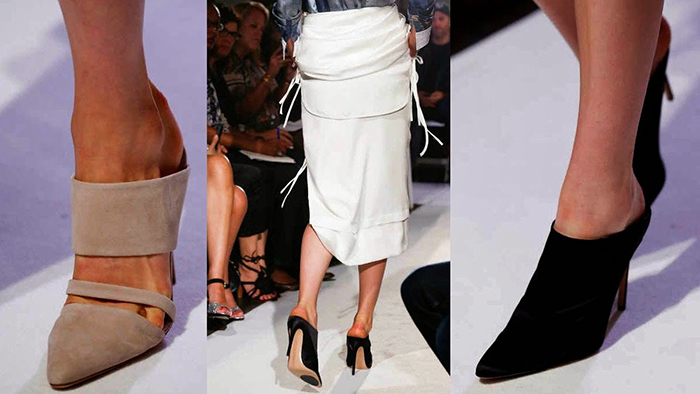 要说不带后跟的凉鞋其实年年都有,而被称作“穆勒鞋”的鞋款则是在 2013 年前后火起来的。在那一年里,鱼嘴粗跟的皮质拖鞋被 Prada 、Gucci、Chloé 等大牌放上秀场,便被加持了鞋柜必入款的概念。于是一双高跟拖鞋便在 2014 年更新为尖头潮流,如今慢慢演化成平底或者低跟鞋。