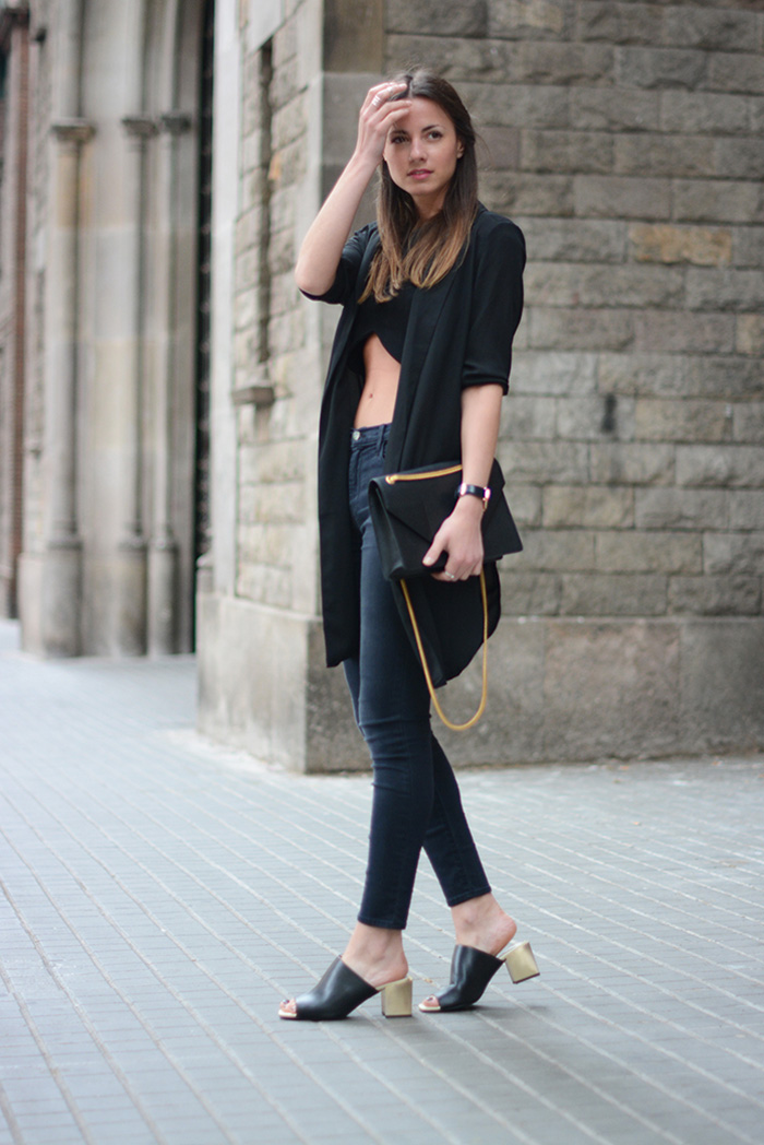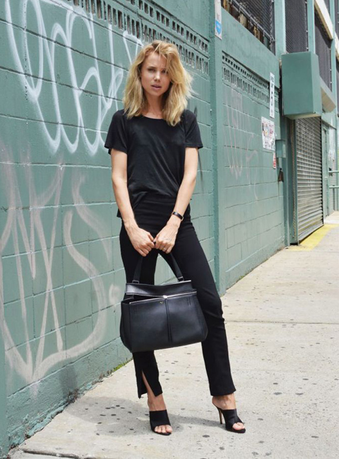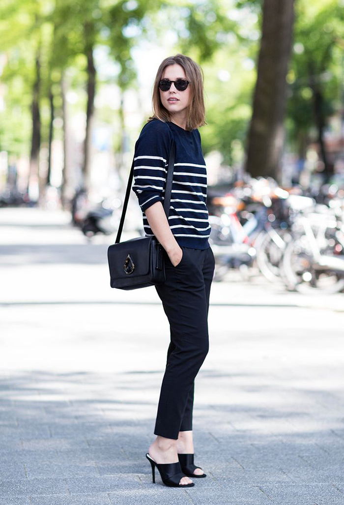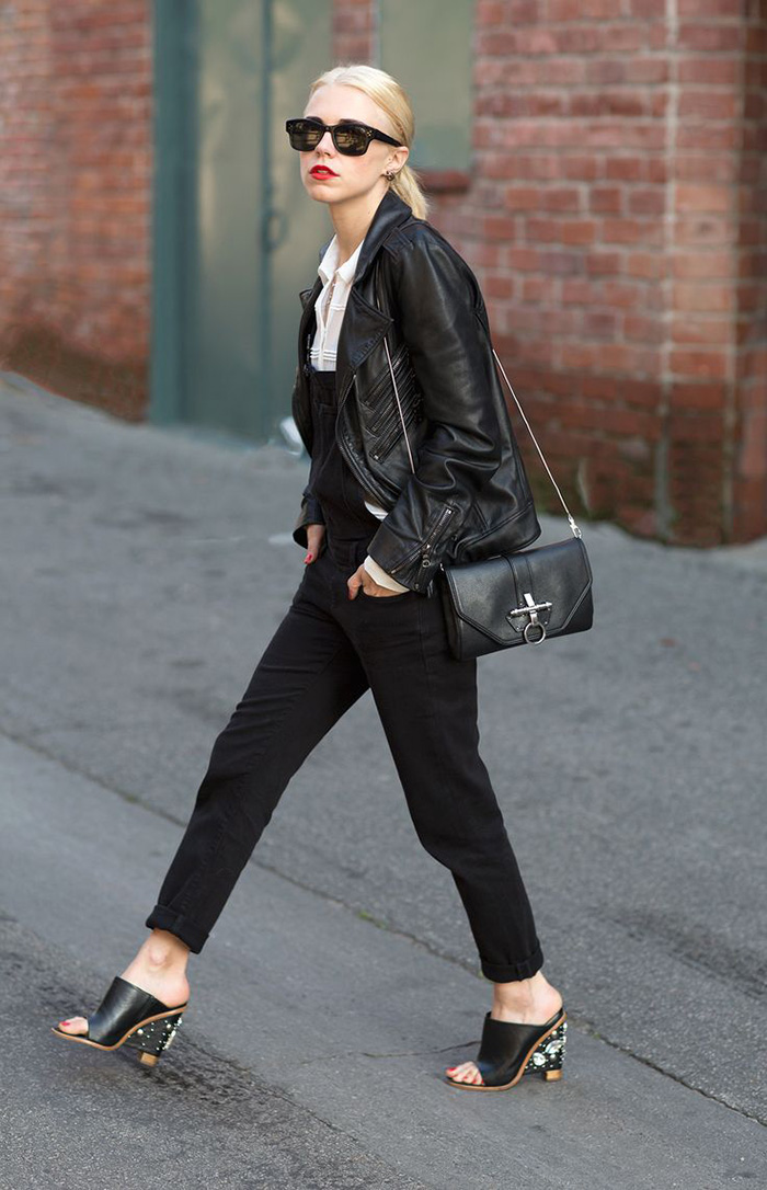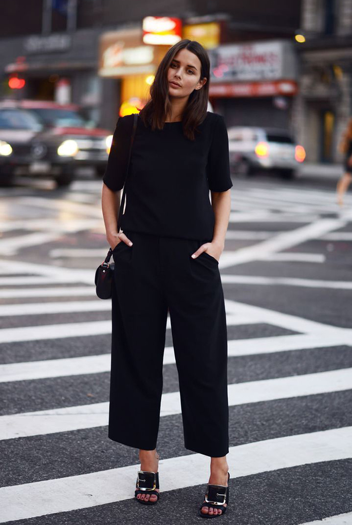最经典的全黑粗跟穆勒鞋,很适合做层次感的穿搭:
