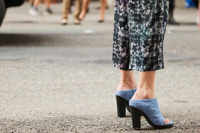 除了 Gucci,花式穆勒鞋跟鞋款还有不少,都可以成为搭配时信手拈来的点睛之笔。比如这只带了绒球的: