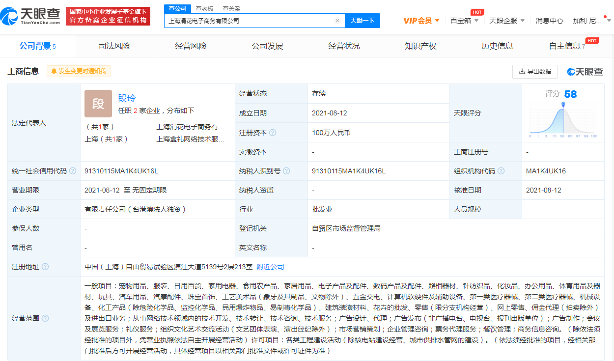据天眼查APP显示,8月12日,上海涓花电子商务有限公司成立,法定代表人为段玲,注册资本100万人民币,经营范围包括日用百货、食用农产品、家居用品等的批发、零售、网上零售、佣金代理及进出口业务;企业管理咨询;餐饮管理等。股东信息显示,该公司由盒马(中国)有限公司全资控股。