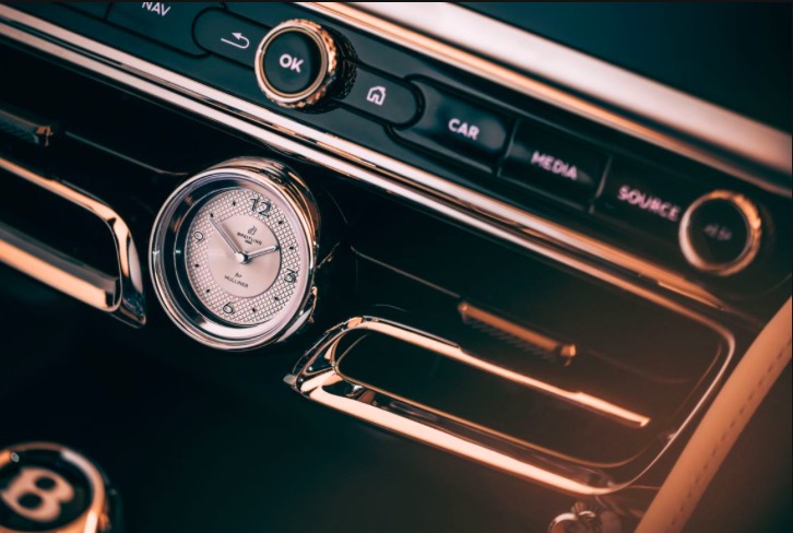 前后排中控台饰以精密仪器打造的菱形定制饰面,仪表板中央位置配以“牛眼式”镀铬出风口和拉丝银“Mulliner”车载计时器。