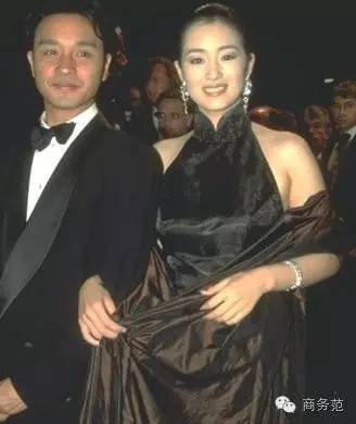 一身黑色缎面中式礼服,配上亮棕披肩,是不是显得贵气十足呢。可是旁边张国荣的头发是怎么回事...( )