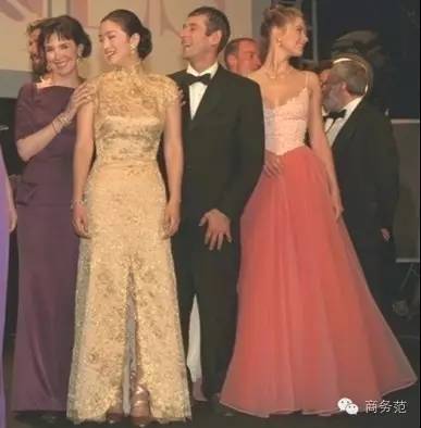 闭幕式时换了一身金色旗袍,你们现在流行的绑带鞋...那时候巩俐就已经开始穿了...