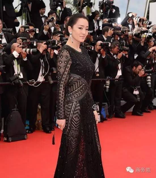 跟着电影《归来》又一次来到戛纳影展,这一年巩皇继续选择了 Roverto Cavalli 的礼服,黑色蕾丝镂空长裙。