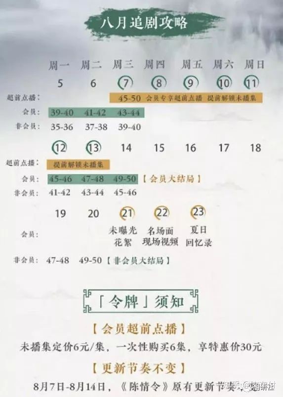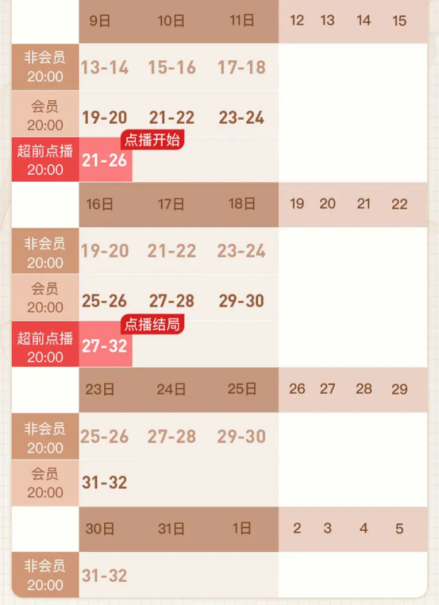平台对于热门网剧的观看,“贴心”地为普通用户、会员用户和氪金超前点播用户制定了分批且具体的追剧日历:
