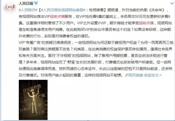 VIP会员不仅要忍受广告,还要多花钱追剧?一时间用户吐槽和质疑纷至沓来,网上引起关于超前点播的热议,绝大多数网友认为这一做法并不合理,平台割韭菜的意图过于明显,甚至促成了盗版行为的出现。讨伐声音越来越大,超前点播甚至受到了人民日报的批评,认为平台这是制造焦虑引导消费。
