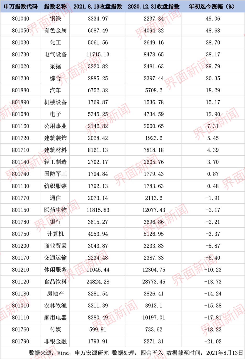 2020年底,申万钢铁指数收盘报2237.34点。截至8月13日收盘,申万钢铁指数上涨0.09%,报收3334.97点。
