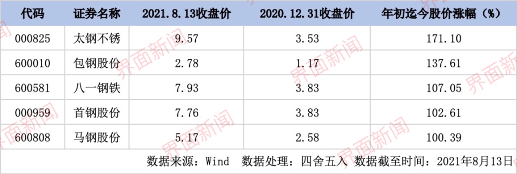 根据界面新闻不完全统计,申万钢铁指数下属个股中,太钢不锈(000825.SZ)、包钢股份(600010.SH)、八一钢铁(600581.SH)、首钢股份(000959.SZ)、马钢股份(600808.SH)股价均已累计翻番。