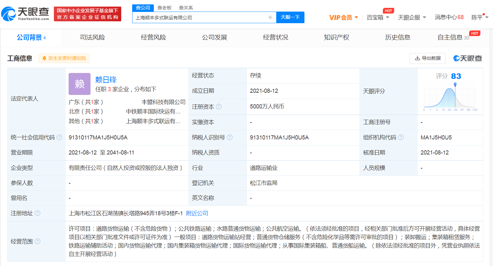 据天眼查APP显示,8月12日,上海顺丰多式联运有限公司成立,注册资本5000万人民币,法定代表人为赖日锋,经营范围包括道路货物运输;公共铁路运输;水路普通货物运输;公共航空运输等。股东信息显示,该公司由顺丰控股关联公司顺丰多式联运有限公司全资持股。