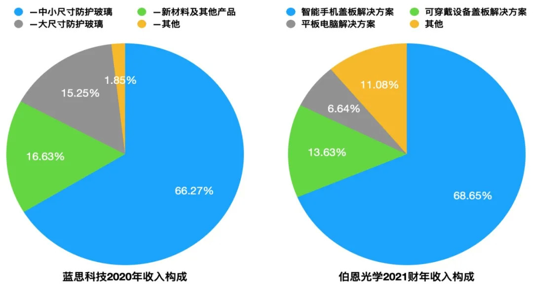 根据招股书,伯恩光学的业务有四部分,分别是智能手机盖板、可穿戴设备盖板、平板电脑盖板和其他业务。蓝思科技的业务也分为四部分,中小尺寸防护玻璃(指手机)、大尺寸防护玻璃(指平板电脑)、新材料及其他产品、其他业务,
