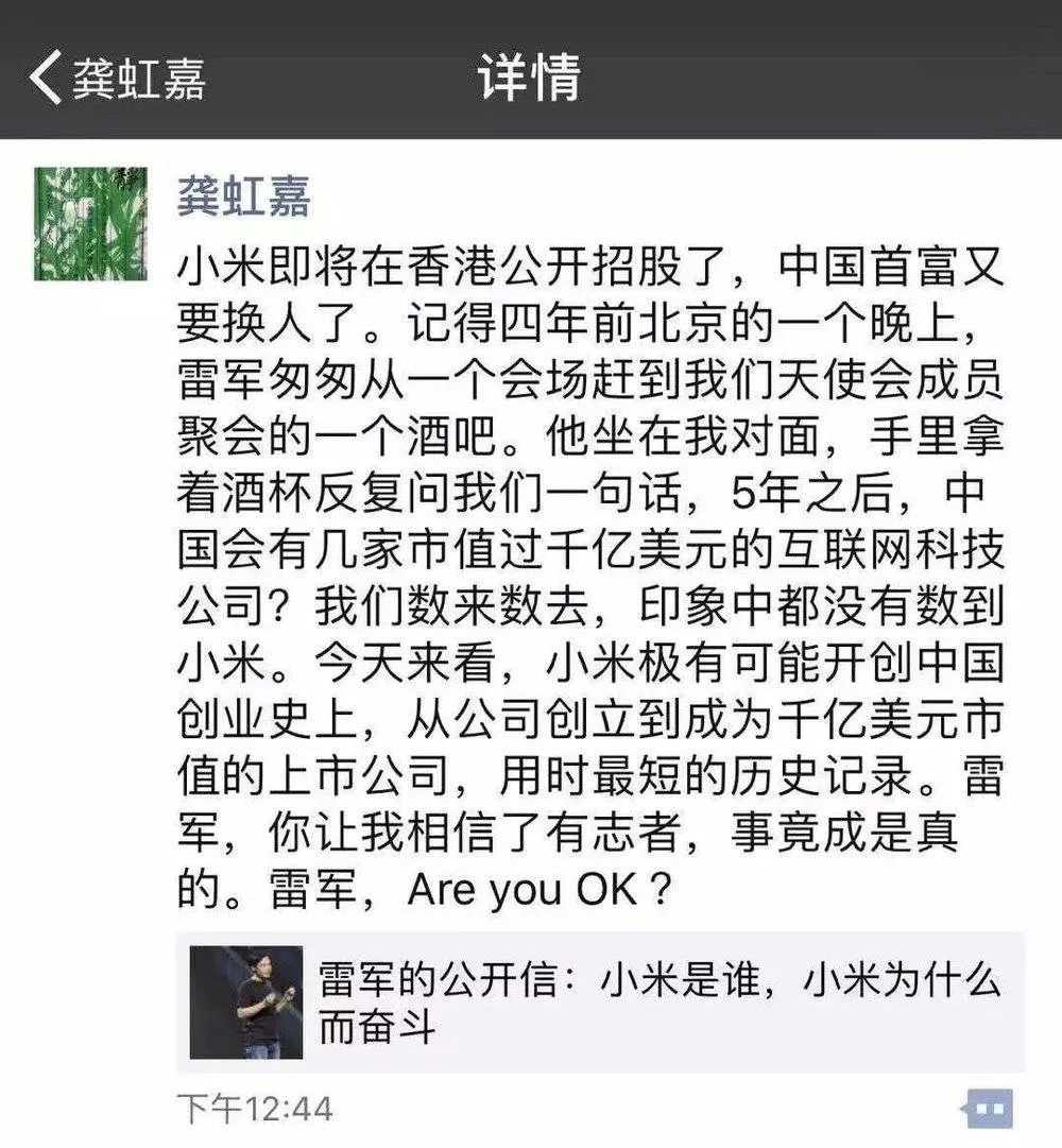 有“中国孙正义”之称的龚虹嘉,数来数去,都没有小米。4年后,小米上市递交上市招股书书,龚虹嘉发朋友圈如此反思:当时谁都没听到雷军煮酒论英雄时的鸿鹄之志。