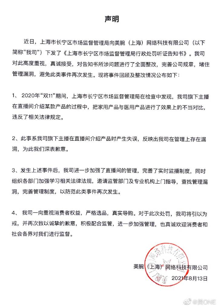 8月13日晚间,李佳琦公司@美ONE 就此前因虚假或者引人误解的商业宣传被罚30万一事发表声明称,2020年“双11”期间,上海市长宁区市场监督管理局在检查中发现,公司旗下主播在直播间介绍某款产品的过程中,把家用产品与医用产品进行了效果上的不当对比,违反了相关法律规定。此事系公司旗下主播在直播间介绍产品时产生失误,公司进一步加强了直播间的管理,完善了实时监播制度。对于此次处罚,公司将引以为戒,并再次致以诚挚的歉意。