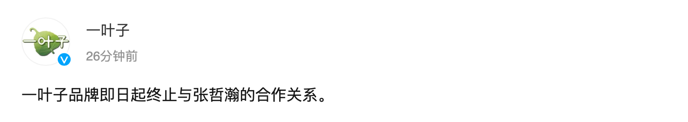 8月13日晚间,@一叶子 发文称,一叶子品牌即日起终止与张哲瀚的合作关系。