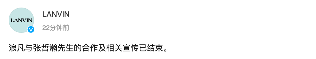 8月13日晚,@LANVIN 发文称,浪凡与张哲瀚的合作及相关宣传已结束。