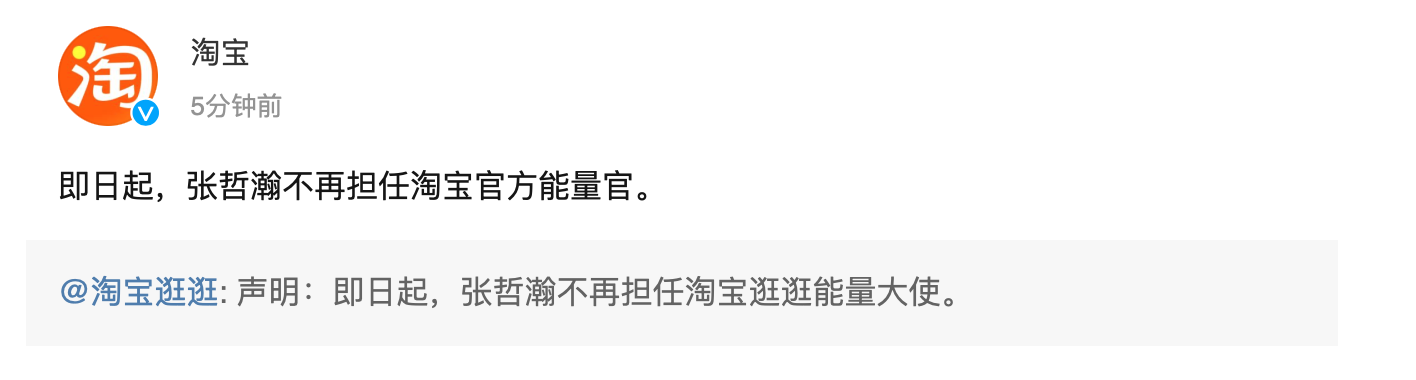 8月13日晚,@淘宝逛逛 发文称,即日起,张哲瀚不再担任淘宝逛逛能量大使。随后,@淘宝 转发该微博表示,即日起,张哲瀚不再担任淘宝官方能量官。