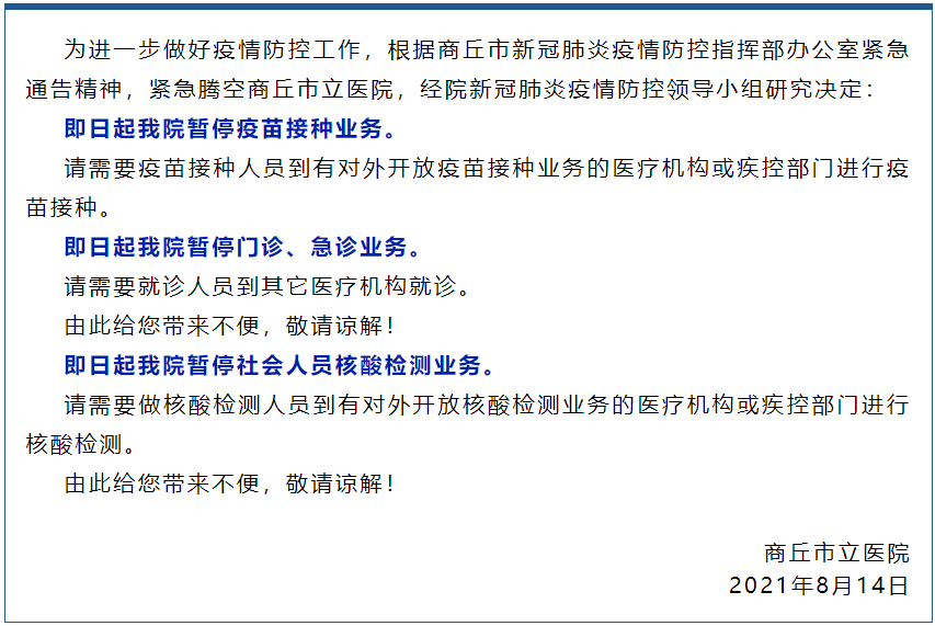 据“网信商丘”消息,商丘市立医院8月14日发布通告,经院新冠肺炎疫情防控领导小组研究决定,即日起暂停疫苗接种业务,暂停门诊、急诊业务,暂停社会人员核酸检测业务。
