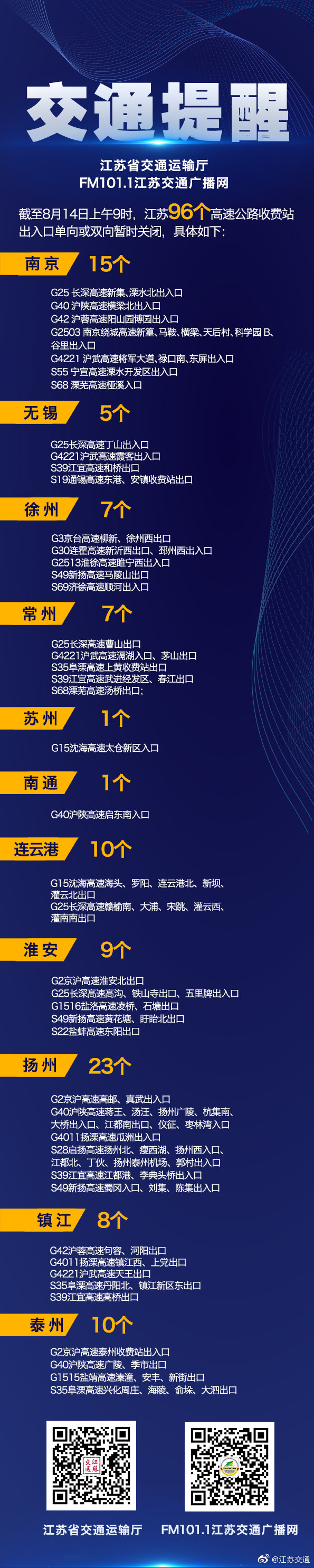 据@江苏交通 消息,截至8月14日上午9时,南京、无锡、徐州、常州、苏州、南通、连云港、淮安、扬州、镇江、泰州等地区96个高速公路收费站出入口单向或双向暂时关闭,具体如图。