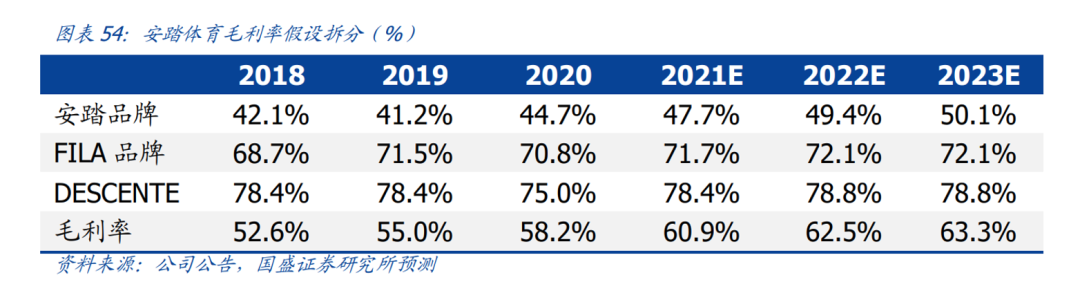 截至2021年上半年,安踏体育承担亚玛芬的亏损约4.4亿元,但是同比2020上半年的7.2亿元大幅收窄,此外,斐乐、迪桑特等运营成熟的高端线还在带着安踏的毛利率一路走高。国盛证券研报也显示,斐乐、迪桑特这两个高端品牌在未来三年毛利率会越来越高,为安踏的盈利能力“添砖加瓦”。