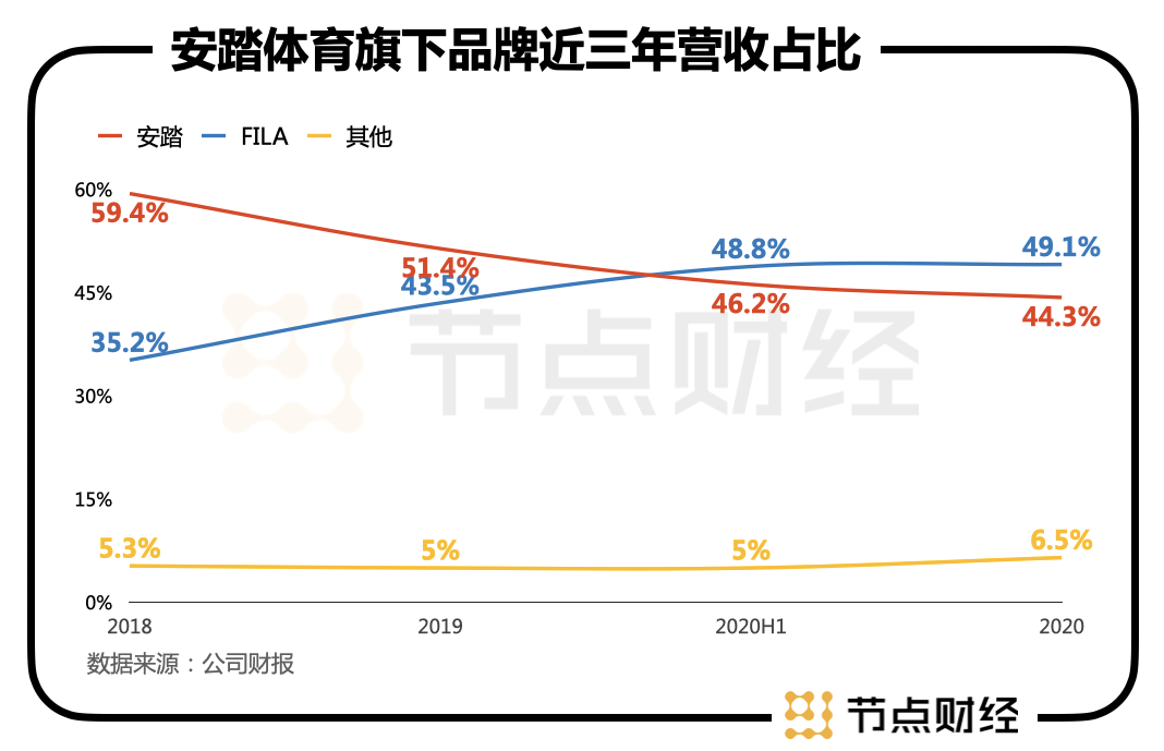 例如2019年安踏主品牌实现营收174.5亿元,同比增长21.8%,占总营收的51.4%;FILA实现营收147.7亿元,同比增长73.9%,占总营收的43.5%。到了2020年,FILA的营收超越安踏主品牌,2020年安踏主品牌实现收入157.49亿元,同比下降9.7%;FILA实现收入174.5亿元,同比增长18.1%。