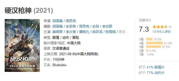 从影片完成度来看,《硬汉枪神》的质量在网络电影中确属于上乘。动作场面、细节、质感皆有,套路之余不乏创新,让人眼前一亮。然而不过短短七天时间,1.3w的豆瓣网友就已经把这部影片的豆瓣评分打落至7.3分。