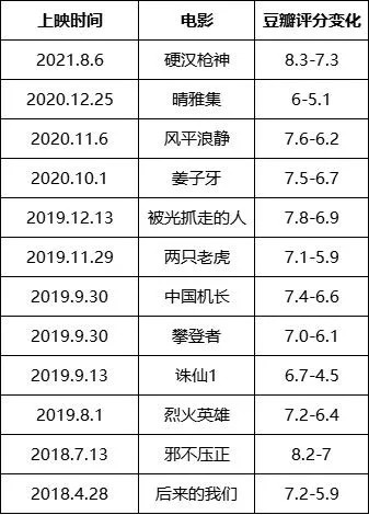 我们大致整理了近三年中上映的十余部豆瓣评分波动过大的国产电影,能够直观看出,这些影片大多都从开分时的一个相对较高的口碑水平一路下滑,部分影片的跌幅甚至超过了2分。