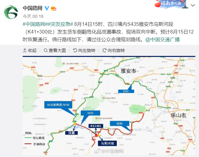 据@中国路网 微博消息, 8月14日15时,四川境内S435雅安市乌斯河段(K41+300处)发生货车侧翻危化品泄漏事故,现场双向中断。8月15日4时10分,事故处理完毕。