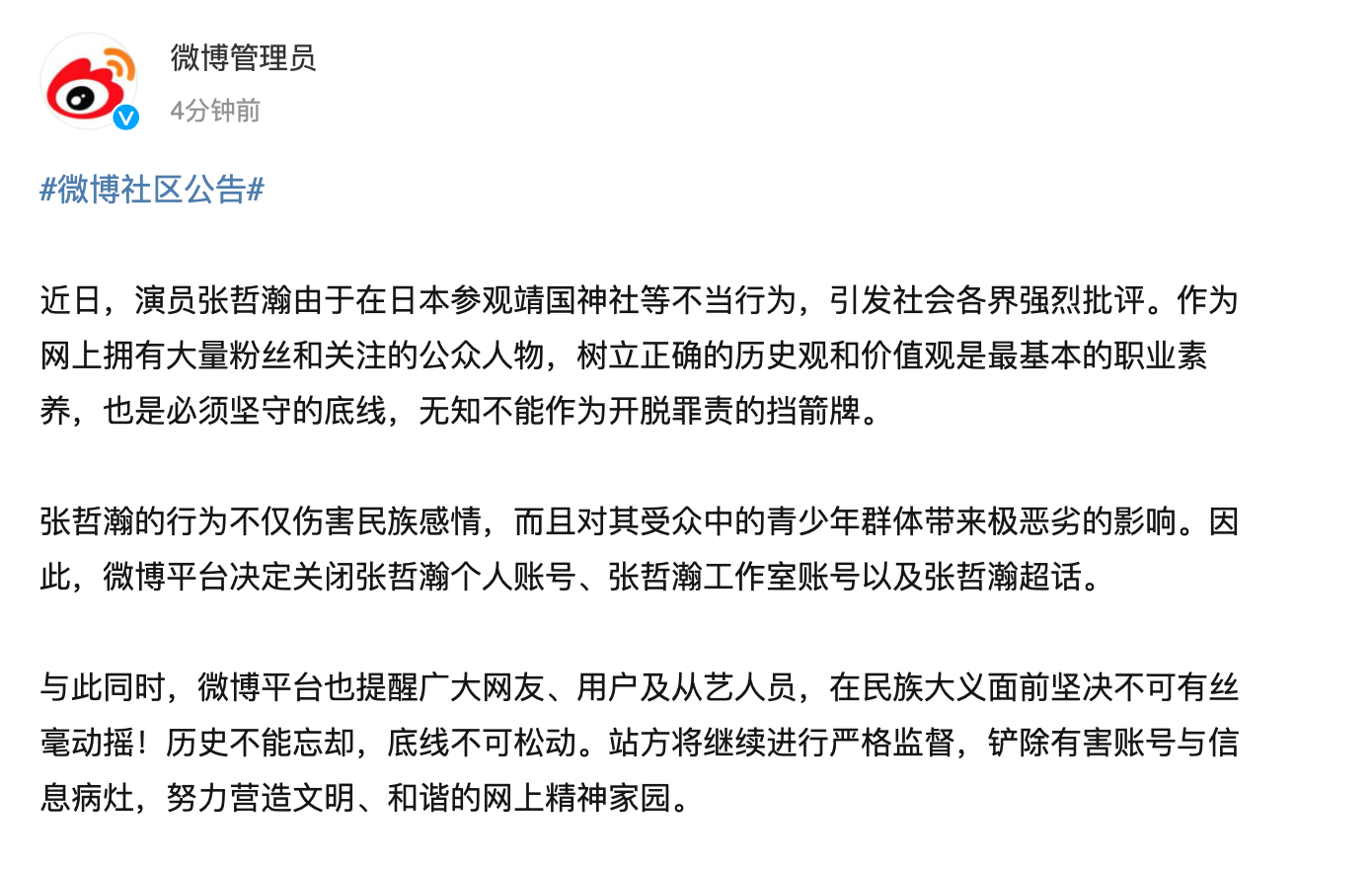 8月15日,@微博管理员 发布微博社区公告称,近日,演员张哲瀚由于在日本参观靖国神社等不当行为,引发社会各界强烈批评。作为网上拥有大量粉丝和关注的公众人物,树立正确的历史观和价值观是最基本的职业素养,也是必须坚守的底线,无知不能作为开脱罪责的挡箭牌。