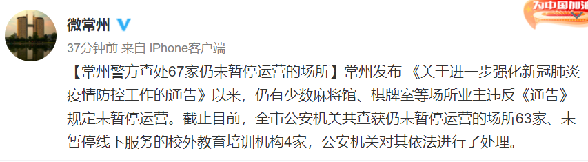 据@微常州 微博消息,常州市发布 《关于进一步强化新冠肺炎疫情防控工作的通告》以来,仍有少数麻将馆、棋牌室等场所业主违反《通告》规定未暂停运营。截止目前,全市公安机关共查获仍未暂停运营的场所63家、未暂停线下服务的校外教育培训机构4家,公安机关对其依法进行了处理。