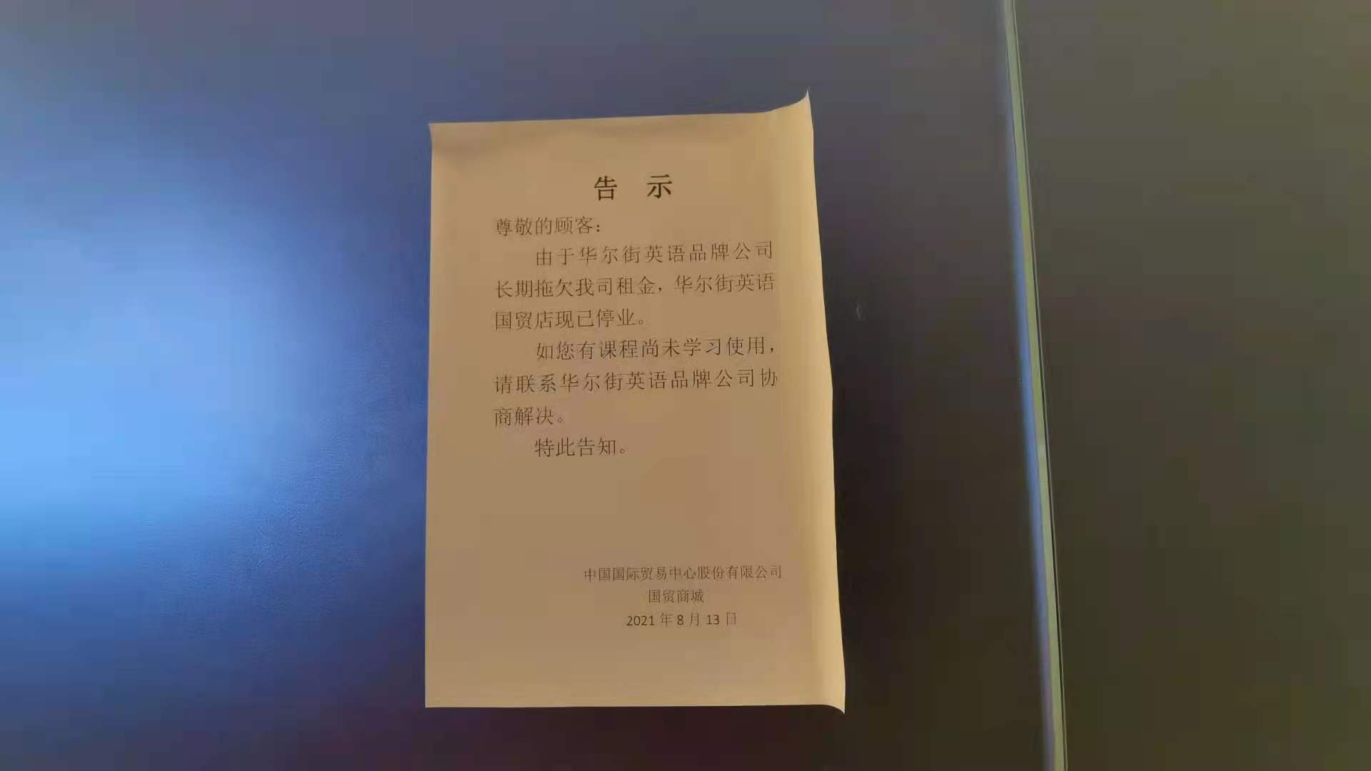 8月14日下午,界面教育来到位于北京国贸商城负一层的华尔街英语国贸店,该中心已被关闭。商城方通知:“由于华尔街英语品牌公司长期拖欠我司租金,华尔街英语国贸店现已停业。”落款日期为8月13日。