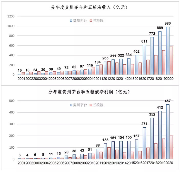 终于我们熟悉的,属于茅台的时代来了。转折点发生在2005年,这一年,贵州茅台的收入虽然还落后于五粮液,但净利润已经超过。此后的2008年,贵州茅台收入短暂超过五粮液,茅台真正的碾压五粮液要从2013年开始,无论从收入还是净利润,茅台跟五粮液都真正的拉开了差距。