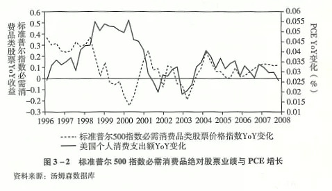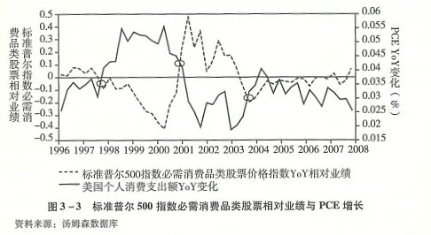 第一张是必需消费品股票自身的表现与PCE,也就是个人消费支出之间的关系图,可以发现,双方的走势基本上是同向的。这意味着个人消费支出越高,必需消费品企业的盈利越高,股票的表现也越好。但也不是总是如此,在上世纪90年代末,个人消费支出表现很好,但必需消费品股票表现却很差,因为那个阶段的牛市让资金转向了弹性较大的科技股。