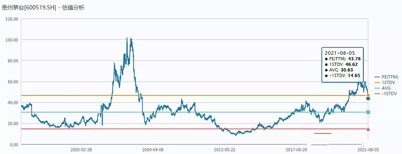 过去20年,贵州茅台的估值,平均为31倍,现在是44倍。