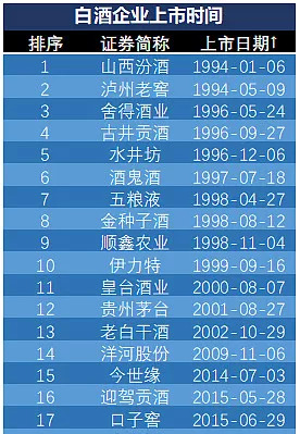 山西汾酒上市之后,其他白酒企业纷纷效仿,掀起了一股上市热潮,1994年5月9日,泸州老窖深交所上市,1996年舍得酒业、古井贡酒、水井坊上市,1998年五粮液、金种子酒上市,再往后,2001年贵州茅台上市,2009年洋河股份上市。