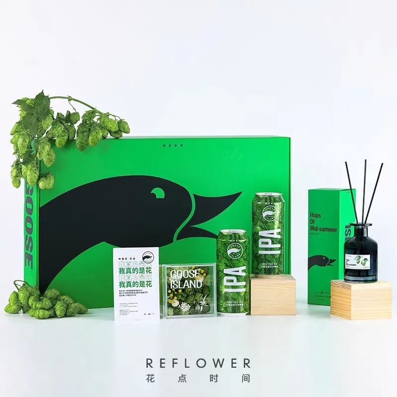 聪明的品牌会进行强强联合,比如稚优泉选择花加、丸美东京联名野兽派。精酿啤酒品牌鹅岛则与花点时间联名,别有新意地在礼盒中放置了卡斯卡特永生啤酒花,与一众玫瑰花有效区分。这样的礼物不仅适合送给男生,同样适合女性送给同性好友或是自己独酌、悦己消费的选择。