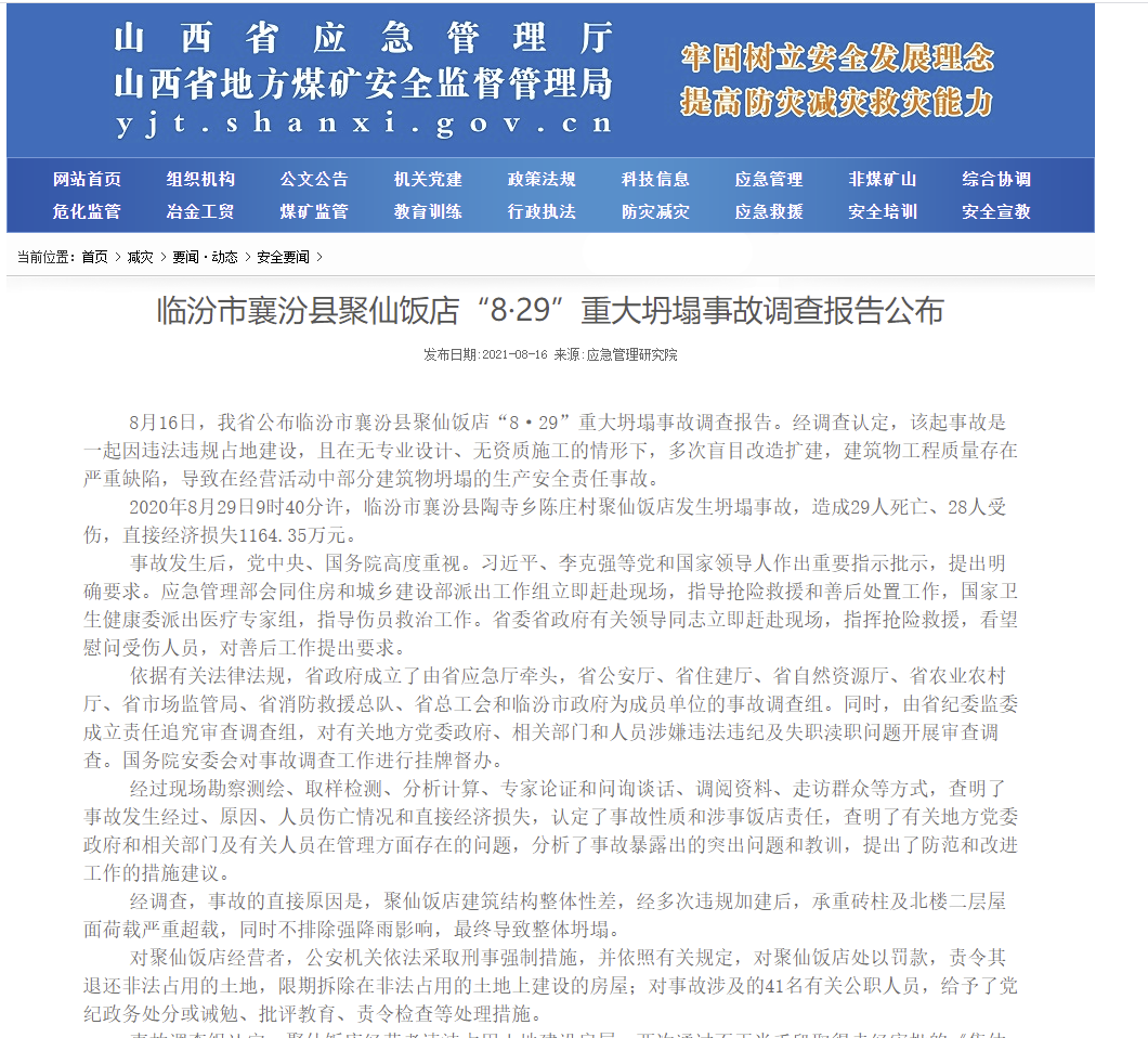 山西省应急管理厅网站消息,2021年8月16日,山西省公布临汾市襄汾县聚仙饭店“8·29”重大坍塌事故调查报告。经调查认定,该起事故是一起因违法违规占地建设,且在无专业设计、无资质施工的情形下,多次盲目改造扩建,建筑物工程质量存在严重缺陷,导致在经营活动中部分建筑物坍塌的生产安全责任事故。