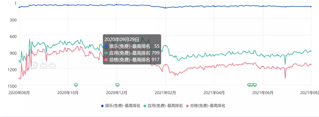 土豆短视频在App Store免费榜近一年的排名趋势,图源点点数据