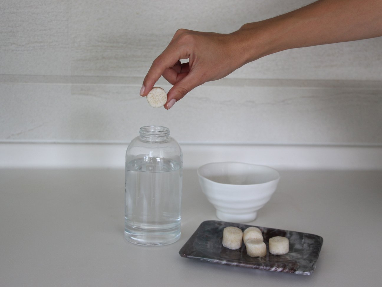 在瓶子里装好温水,投入一片药剂,登上一会儿,就能得到一瓶面霜。