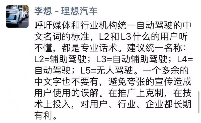 根据截图显示,李想发文称呼吁统一国内现有自动驾驶中文名词,对于L2 、L3一类的用语,用户容易混淆且听不懂,建议统一名称为L2=辅助驾驶;L3=自动辅助驾驶;L4=自动驾驶;L5=无人驾驶,一个多余的中文字也不要有。