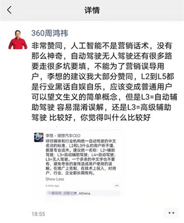 很快,被坊间称之为“红衣大炮”的360创始人、董事长周鸿祎也在其个人社交账号上转发李想朋友圈图片,并称“非常赞同,人工智能不是营销话术,没有那么神奇,自动驾驶无人驾驶还有很多路要走,很多坑要填,不能为了营销误导用户。”